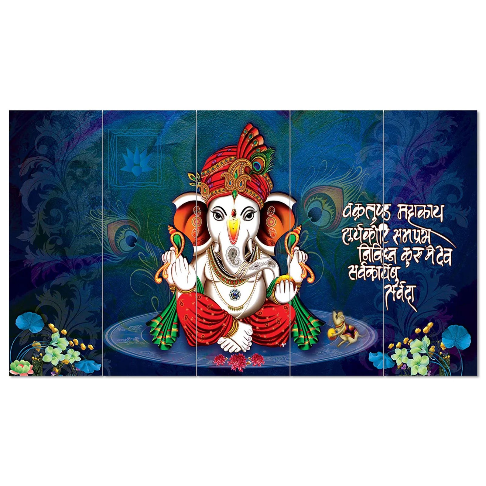 Invite prosperity, wisdom, and divine grace into your home with this exquisite 4-piece wall art set, featuring Lord Ganesha seated in serene majesty against a rich royal blue backdrop adorned with peacock feathers, lotus blooms, and sacred Sanskrit script. To his right, the powerful mantra “वक्रतुण्ड महाकाय सूर्यकोटि समप्रभ” (Vakratunda Mahakaya...) glows in elegant golden Devanagari — invoking blessings for success, clarity, and obstacle-free paths. Designed for spiritual spaces, modern homes, or as a bold statement of faith, this panoramic masterpiece transforms any wall into a temple of color, devotion, and cultural elegance.