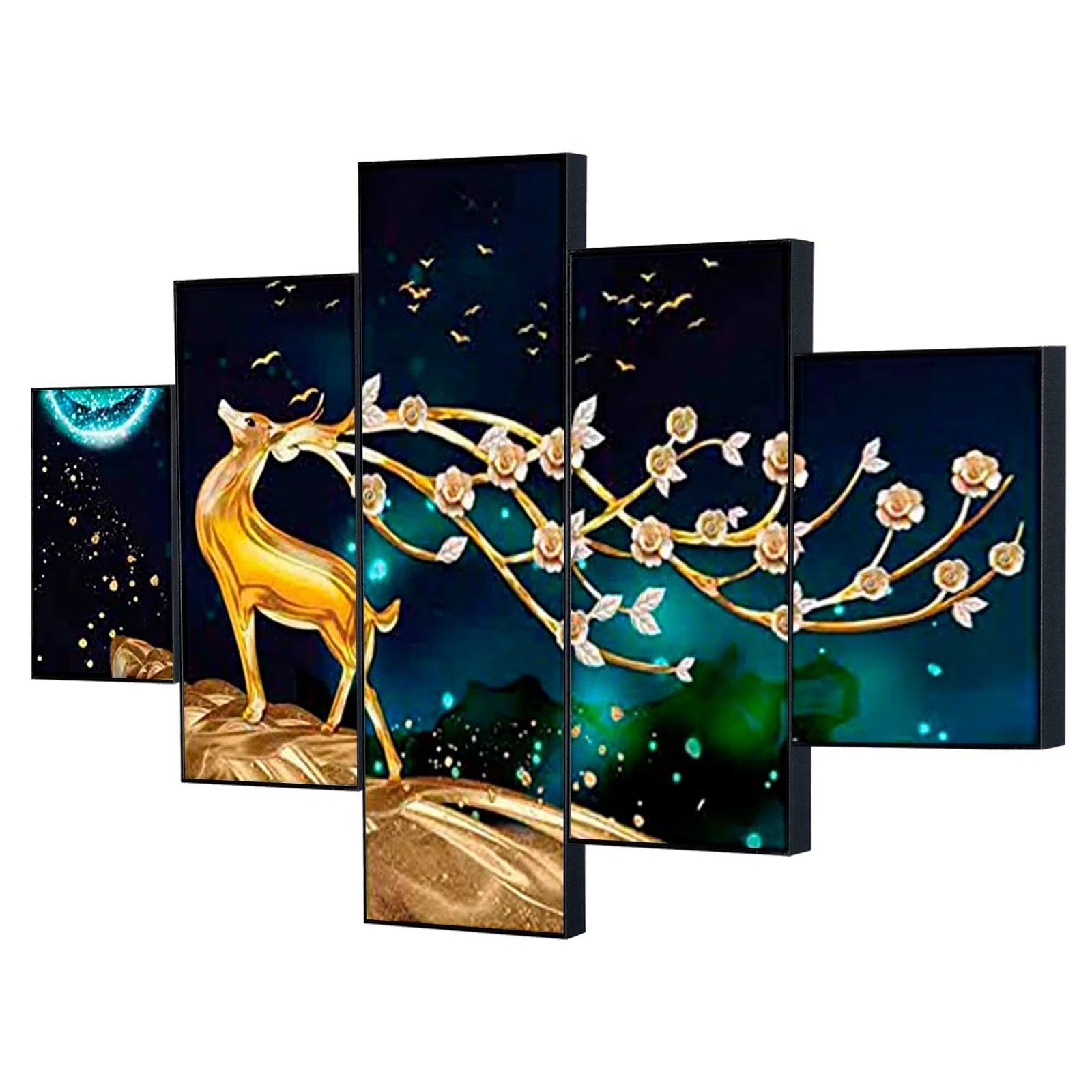 Step into a dreamlike realm where magic blooms and golden light dances — this breathtaking 5-piece wall art set features a majestic golden deer standing beneath a radiant tree of blossoms, all set against a starlit midnight sky with glowing orbs and fluttering birds. Designed for lovers of fantasy, surreal beauty, and artistic grandeur, this panoramic triptych transforms any large wall into an immersive gallery of enchanted nature.