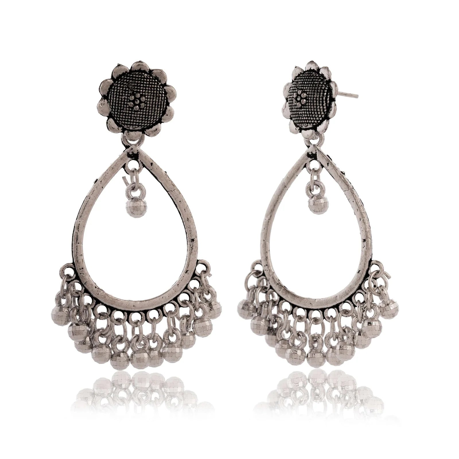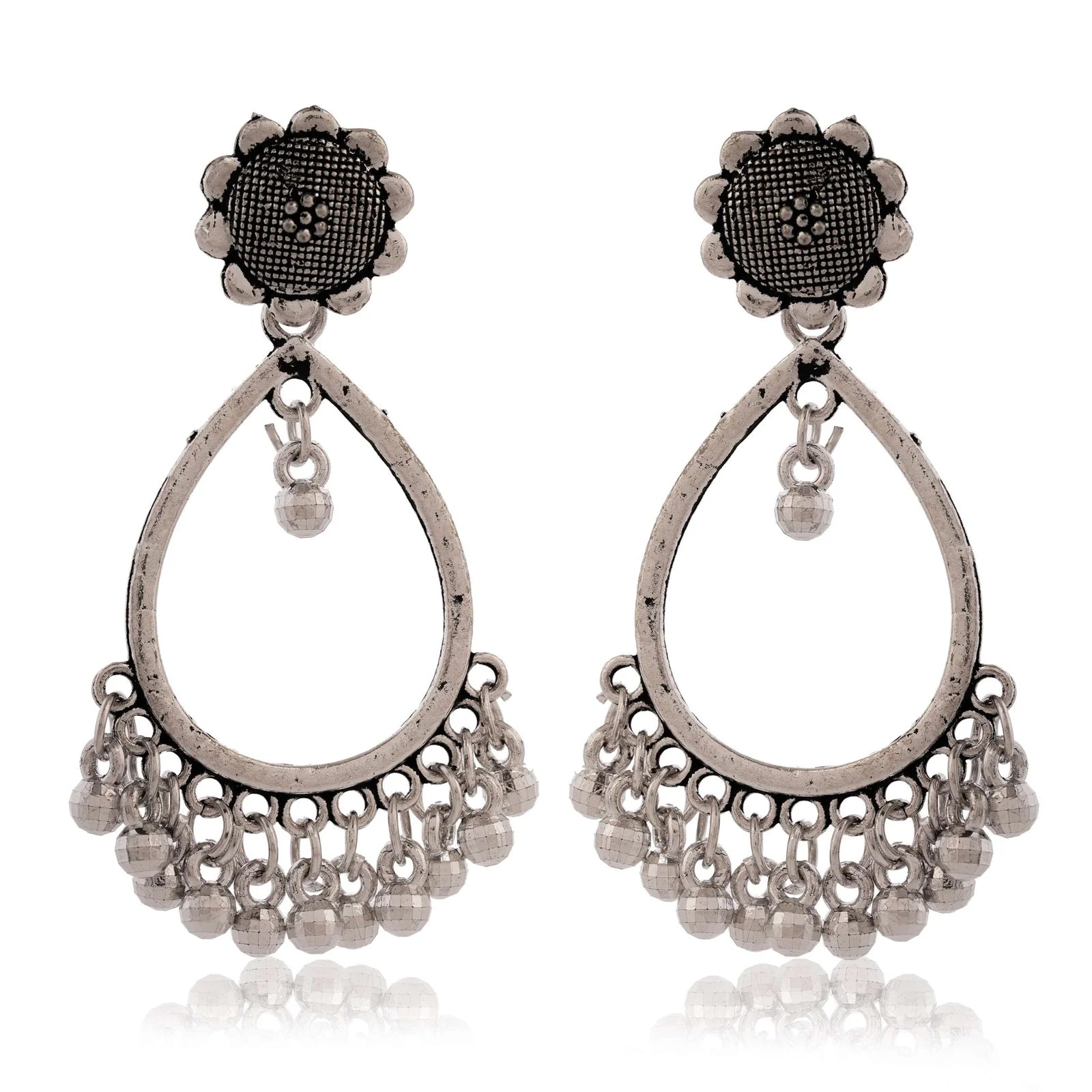 Embrace the vibrant energy of tribal-inspired jewelry with these intricately detailed oxidized silver drop earrings.