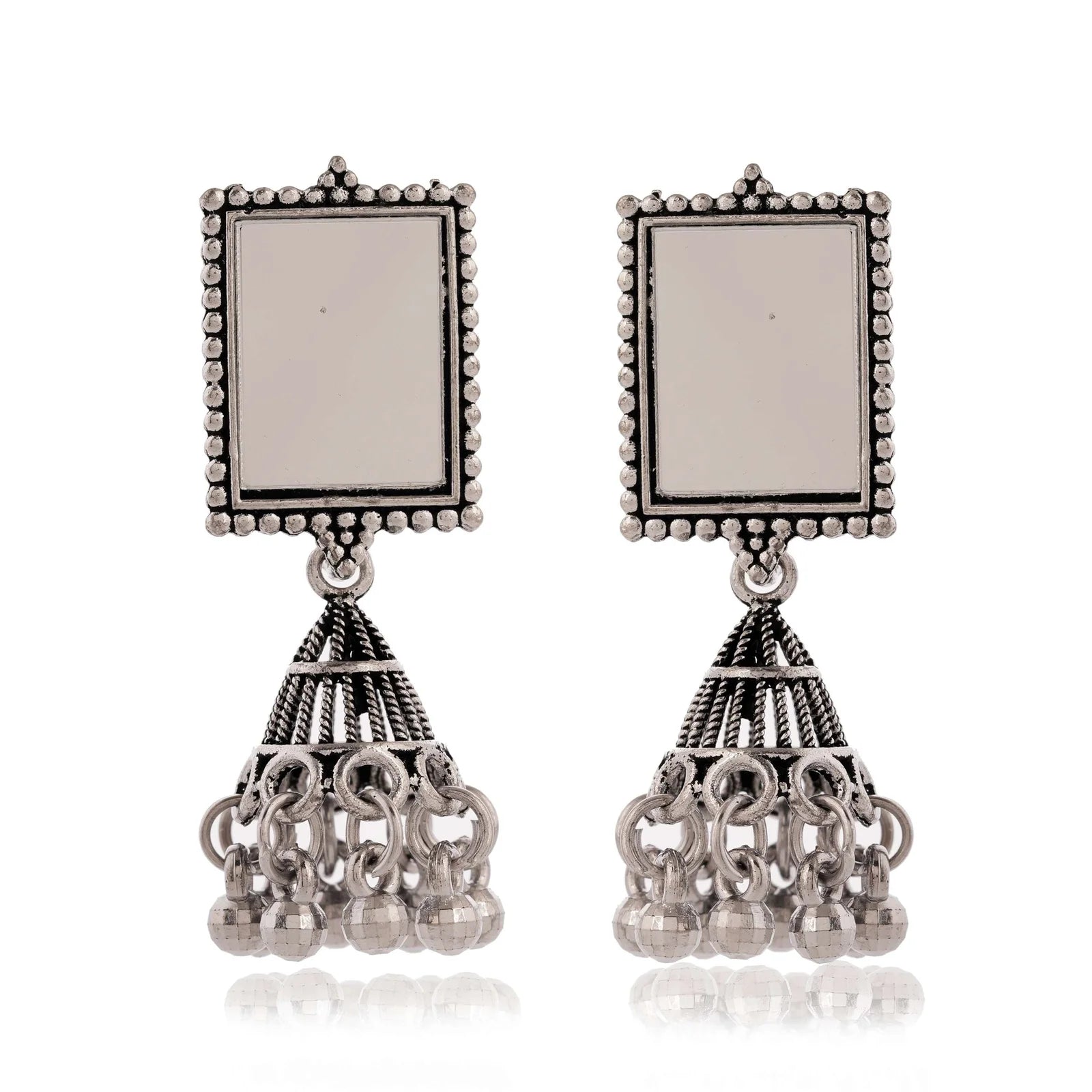 These stunning dangle earrings combine traditional Jhumka structure with a unique, modern geometric element, ensuring an eye-catching accessory perfect for festive occasions or statement everyday wear.