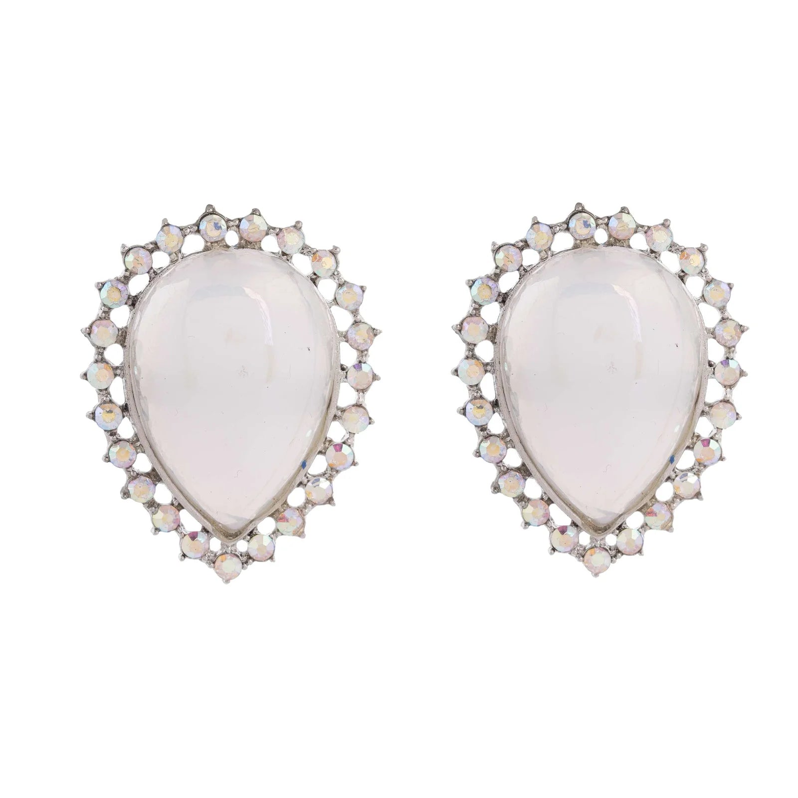 These sophisticated earrings are perfect for those who love soft elegance coupled with captivating shimmer. The design features a large, smooth pear-shaped central stone that possesses a beautiful, milky-white iridescence, casting subtle hints of rainbow color (Aurora Borealis effect).