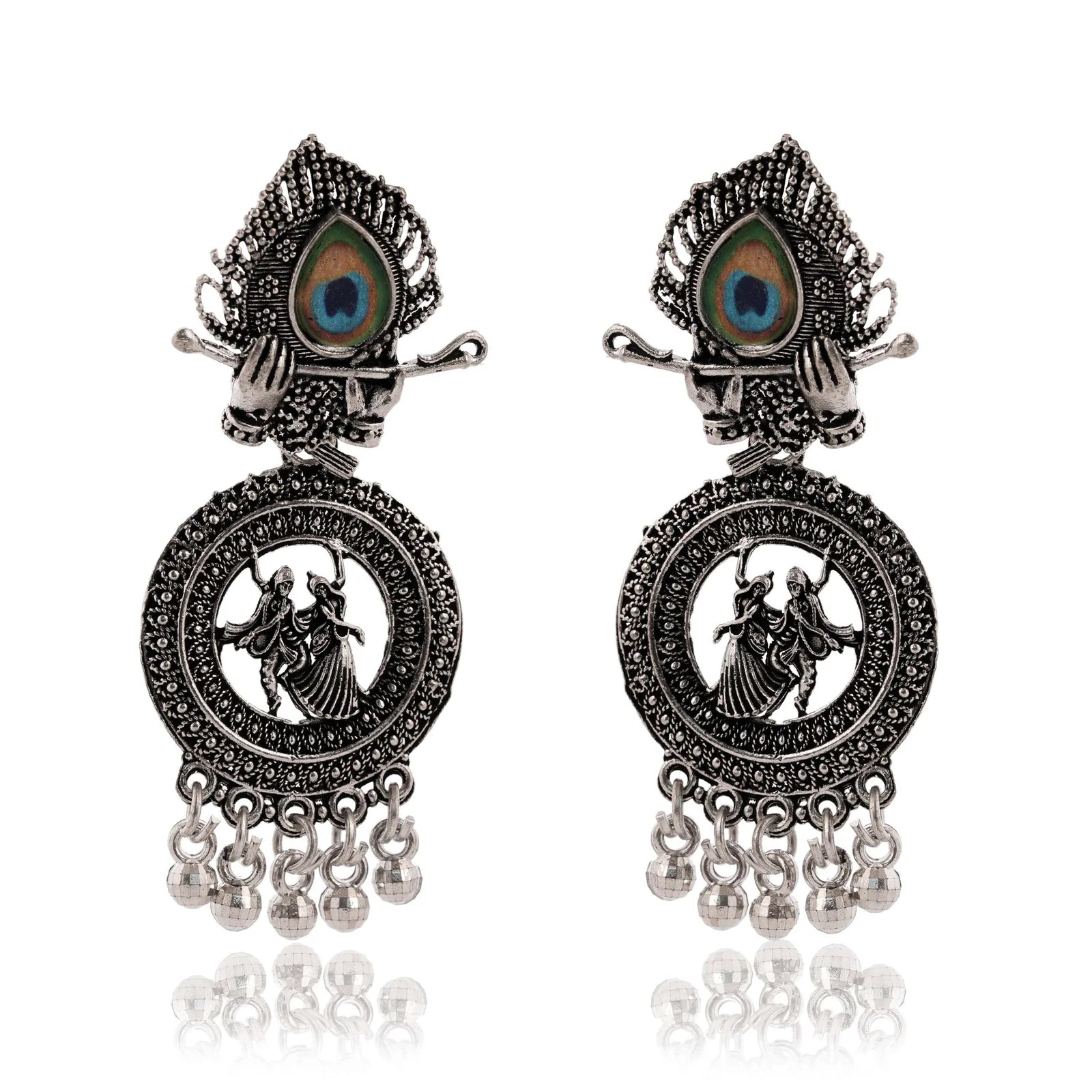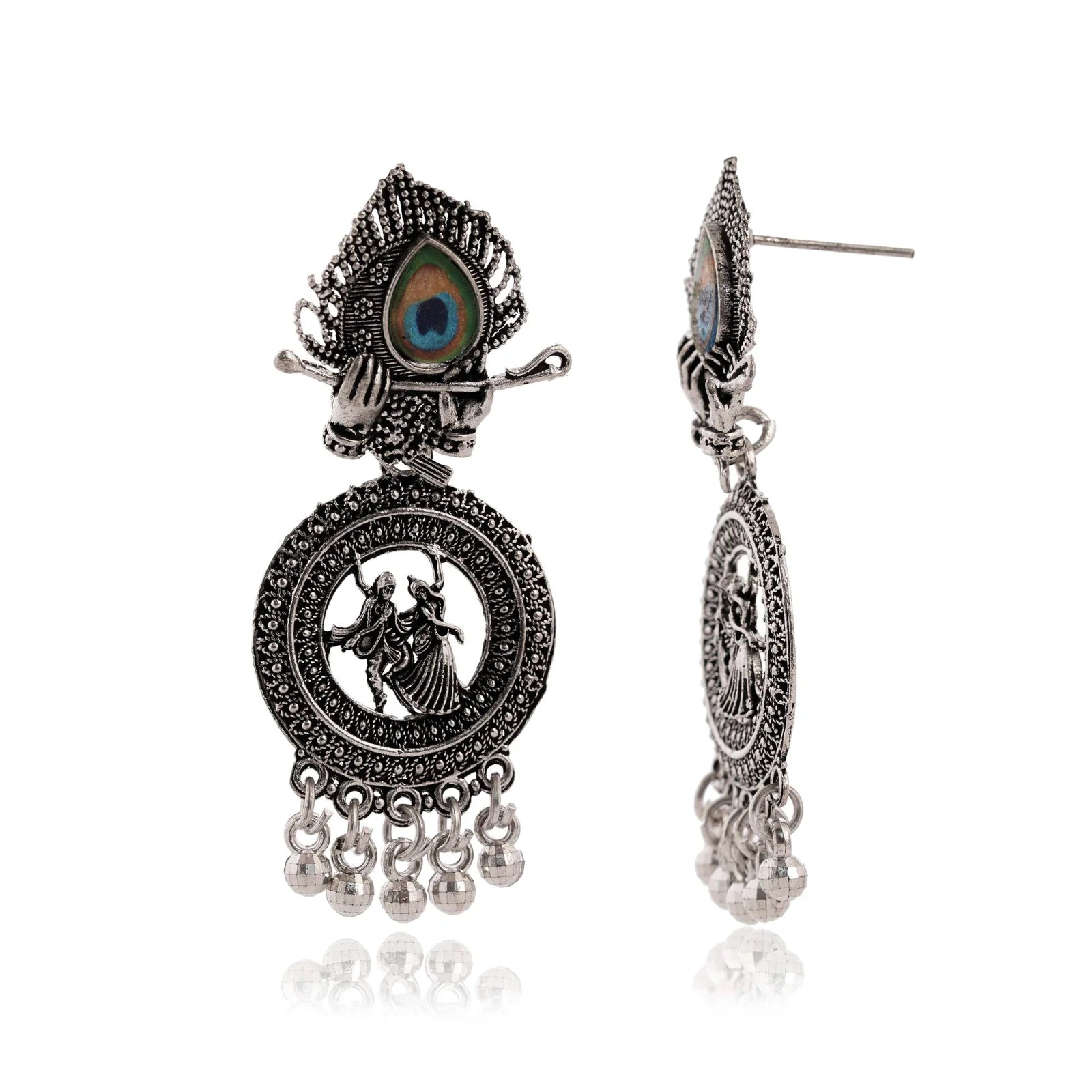Capture the divine romance of Radha and Krishna in these exquisitely detailed, antique-finish statement earrings.