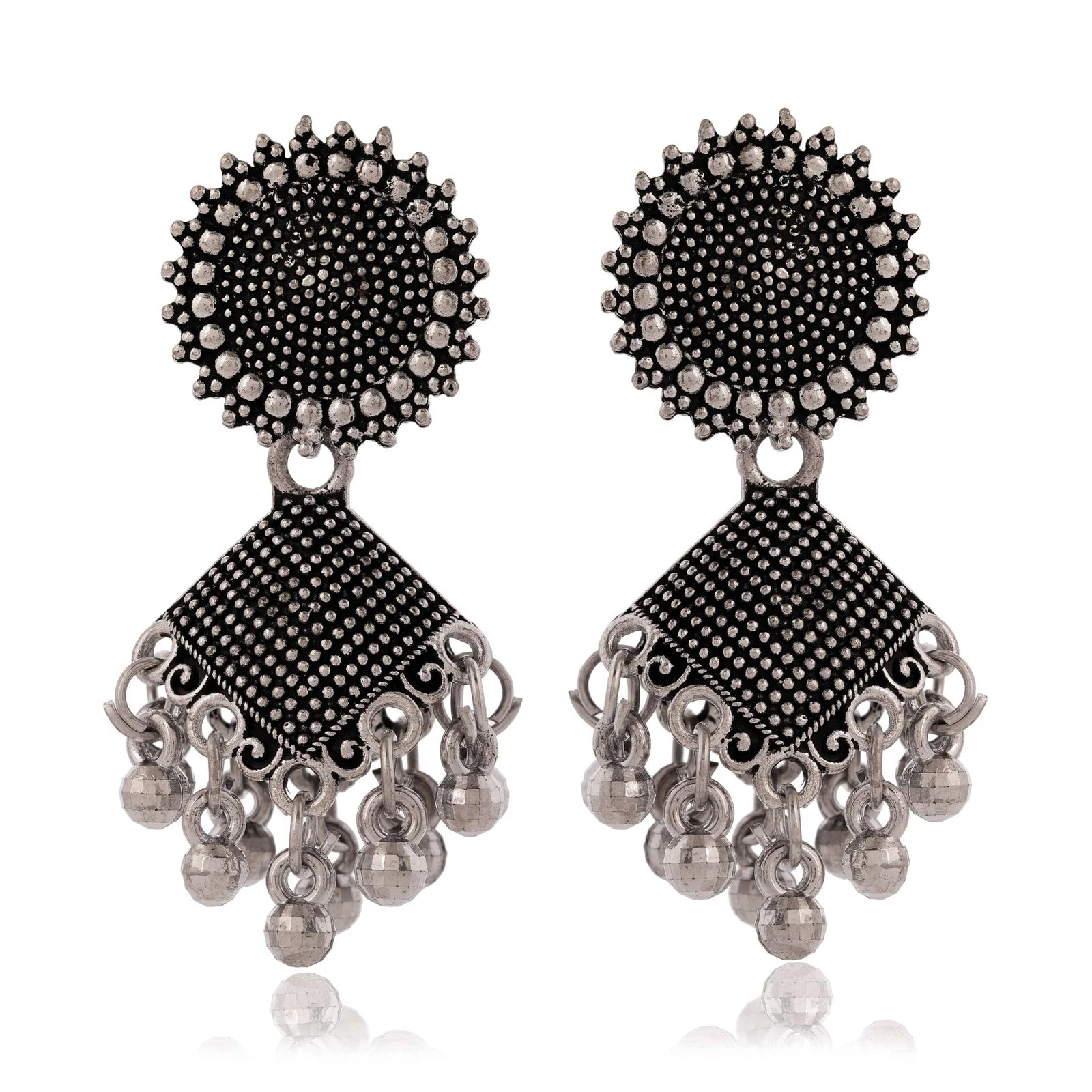 Make a dramatic, culturally rich statement with these intricate oxidized silver earrings, combining floral artistry with classic Jhumka dynamism.