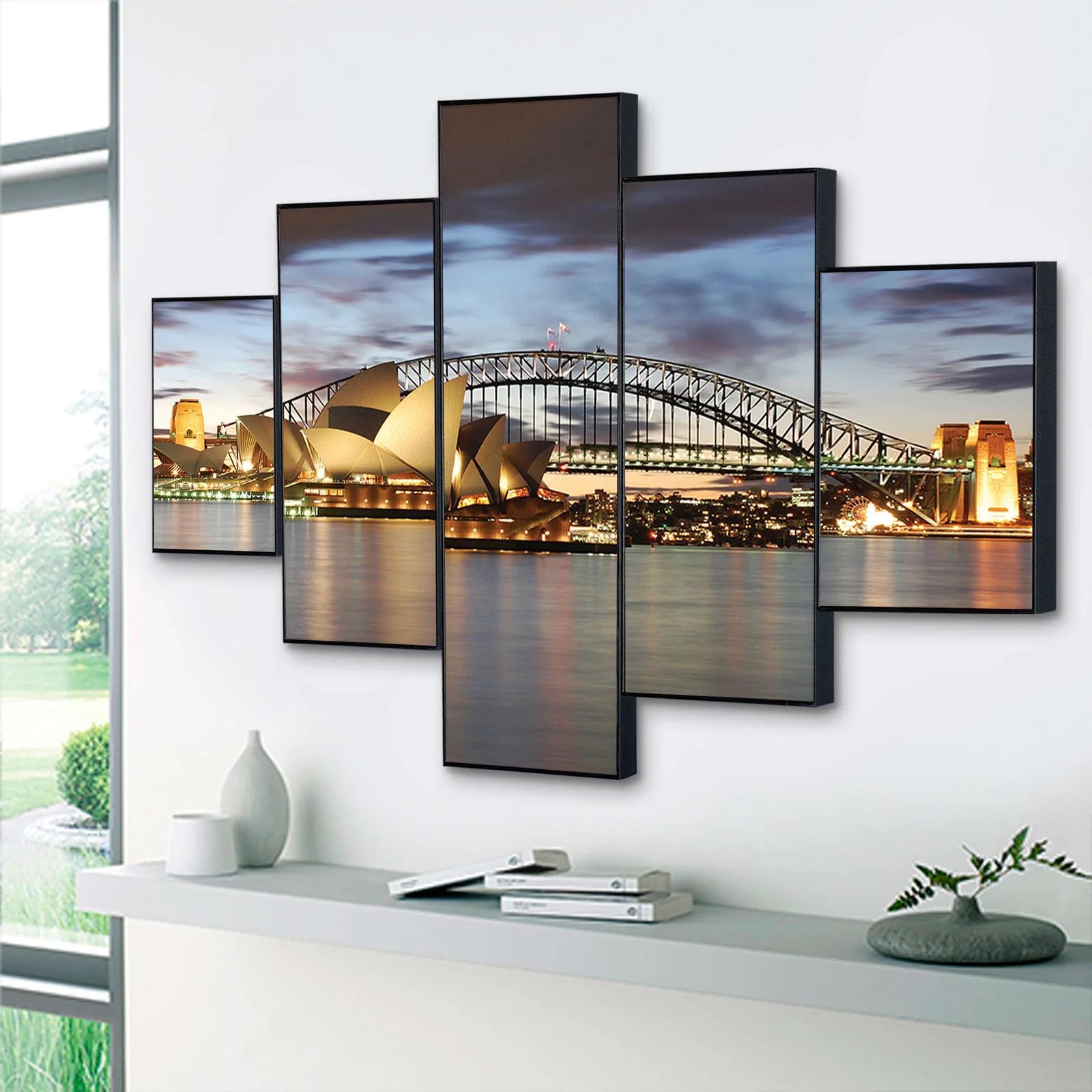Bring the magic of one of the world’s most iconic skylines into your home with this stunning 5-piece panoramic wall art set, capturing the breathtaking beauty of Sydney Harbour at dusk — where the Sydney Opera House glows like a jewel, the Harbour Bridge arches majestically, and city lights shimmer on calm waters beneath a twilight sky. Designed for modern interiors that love travel, architecture, and urban elegance, this multi-panel masterpiece transforms any large wall into a window to Australia’s most celebrated harbor.